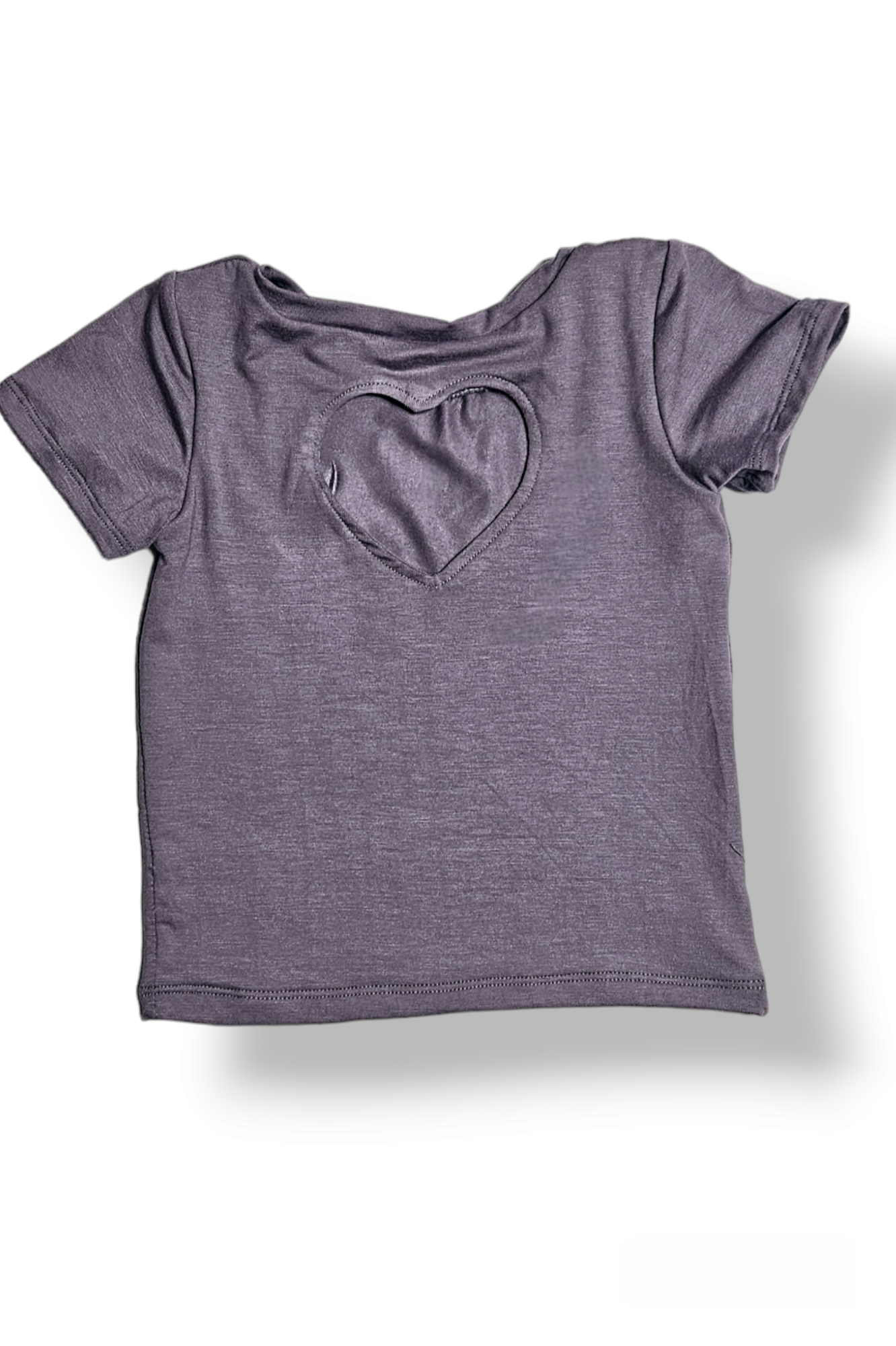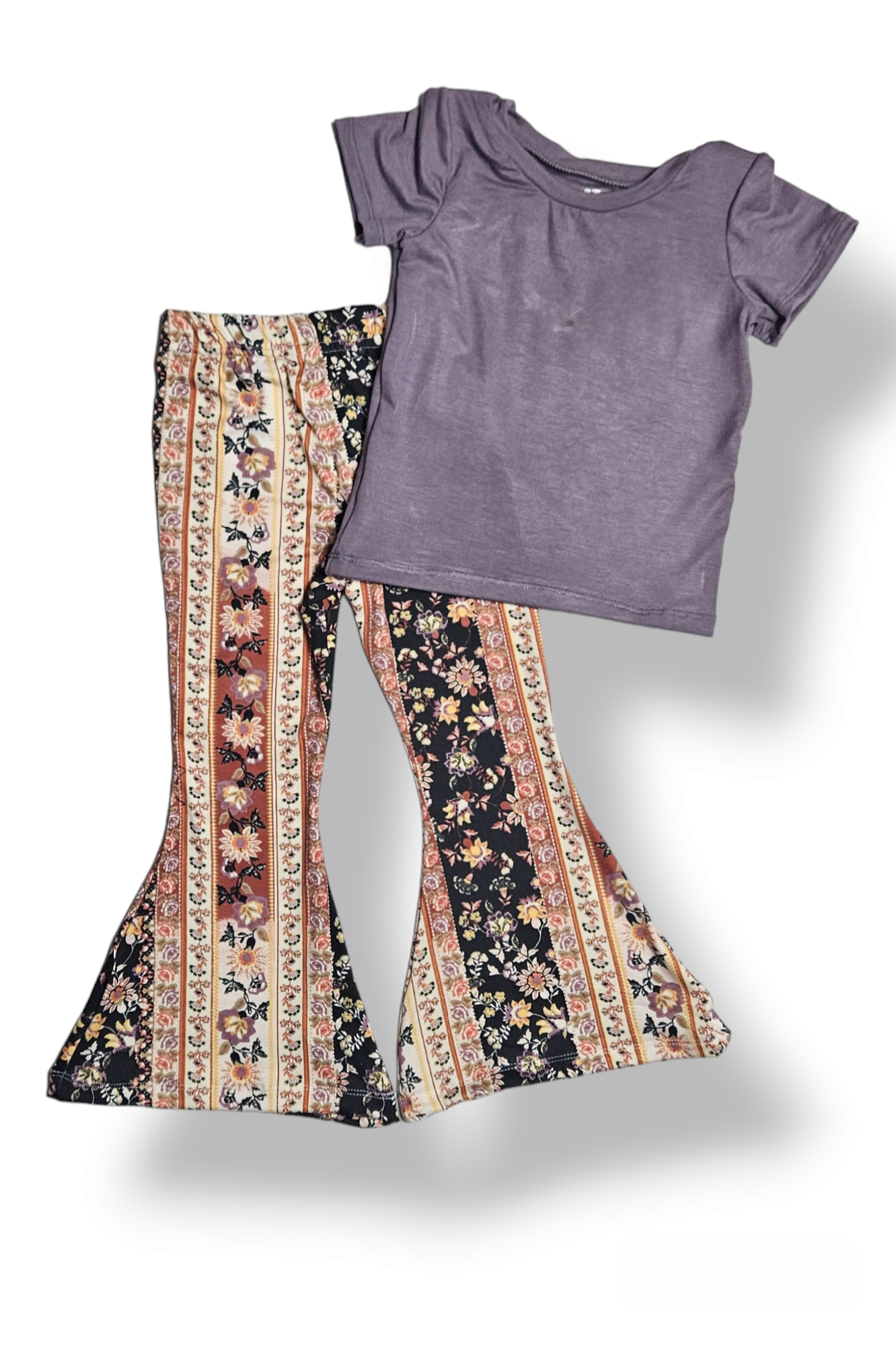 Embrace a playful spirit with this dusty purple top featuring a sweet heart-shaped cutout on the back. Complemented by vibrant floral bell bottoms, this outfit combines comfort and fun for a standout look that’s perfect for any casual outing or festival day.