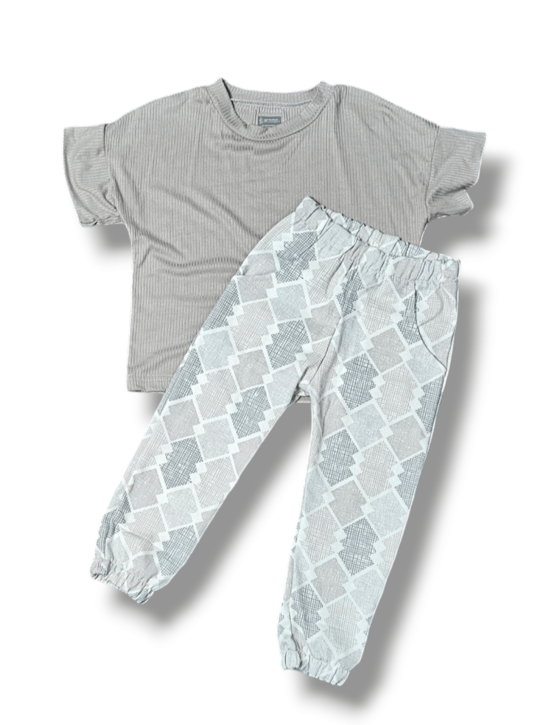 Get the quirky, stylish look in our oversized dolman shirt and cotton pants! The ribbed shirt has long cuffed sleeves while the pants fit snugly with a mix of grey and white hues.