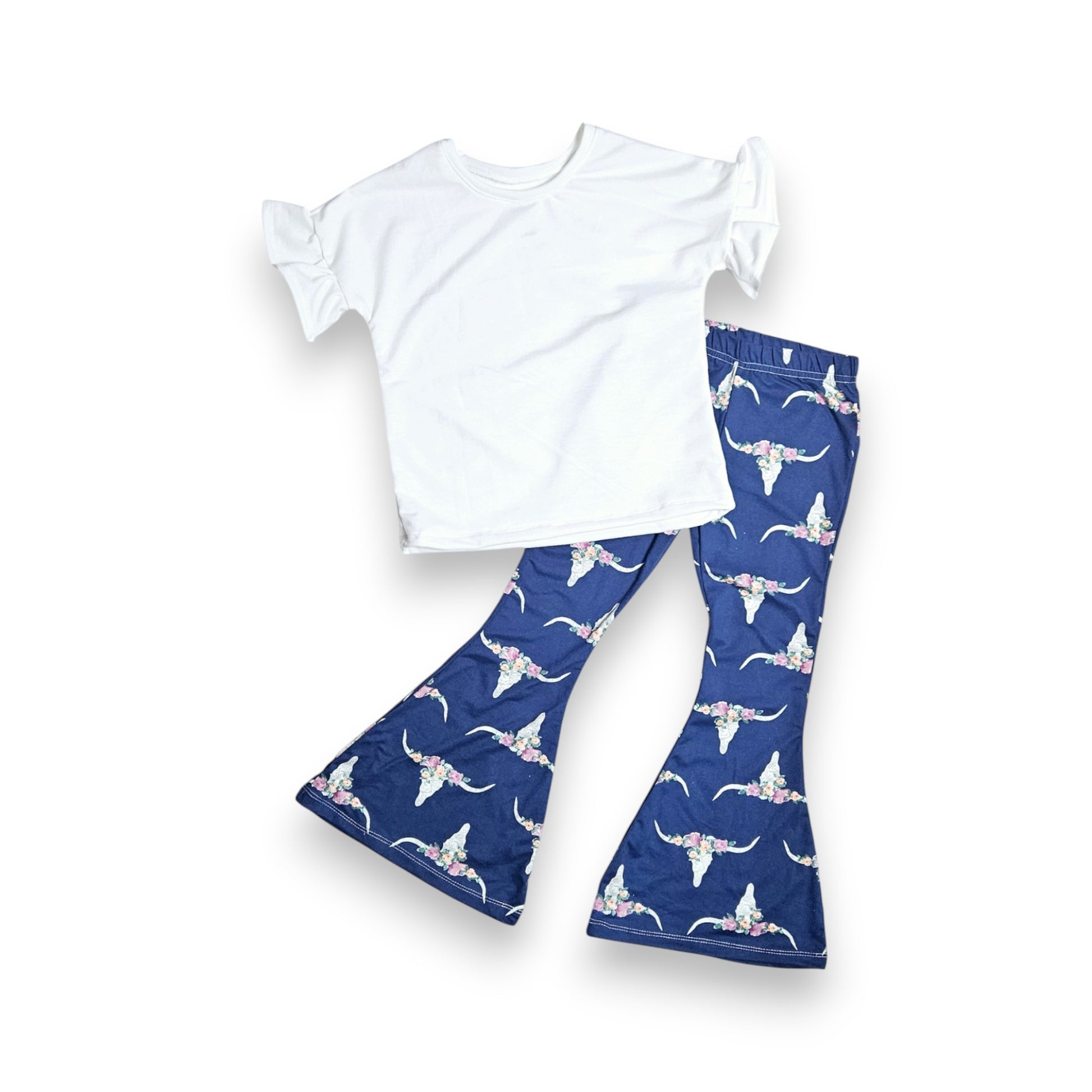 Yeehaw! Take a look at our steer and roses two-piece bell set. The flared pants showcase a steer skull with flowers, while the dolman top is decorated with adorable ruffles. Put on your boots and hit the dance floor!