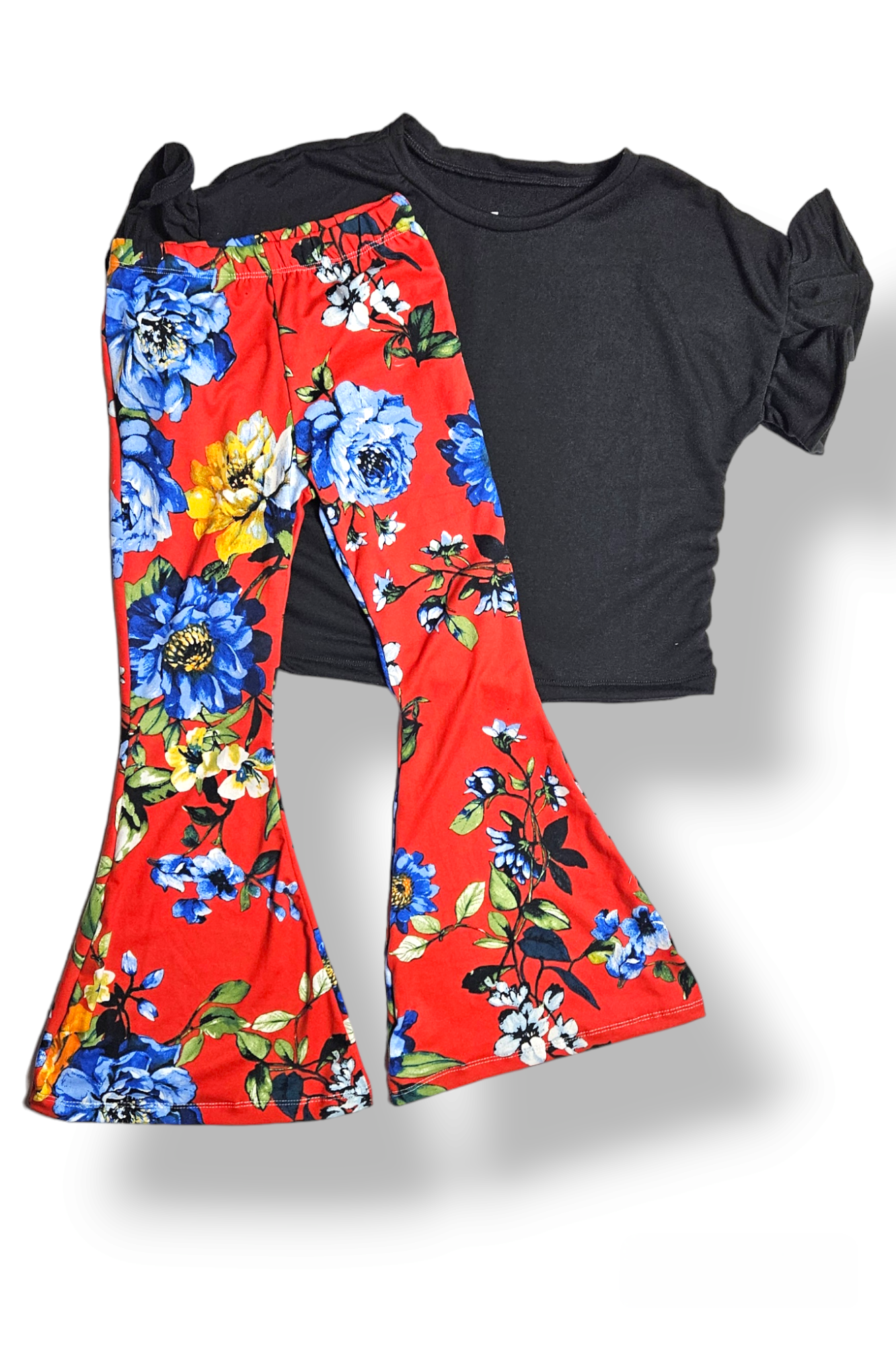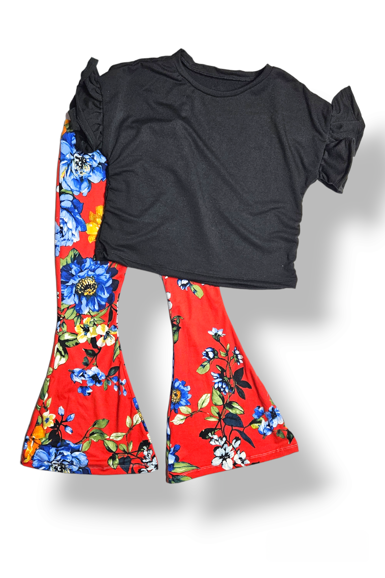 Add a pop of color to your little one's wardrobe with this adorable set! Featuring a black ruffle top and bright red bells with a floral print, this outfit is comfy, cute and full of personality!